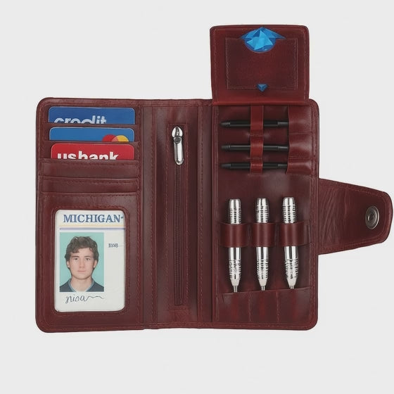 Tired of fishing around your pocket for flights, coins, or that missing stem right before your throw? Meet your new darts sidekick the Buffalo Leather Darts Wallet. This beauty isnt just a wallet, its a darts case that you can carry to the pub: Holds three darts fully loaded and ready to fly. Slots for six stems and six flights because spares are the difference between nice try and nice shot. Four card slots a clear ID window perfect for flashing your player card or buying the next round. A zipper coin pouch for league dues, jukebox change, or that lucky quid youll never spend. Made from rugged buffalo leather, itll age like a fine ale looking better every night you play. So whether youre chasing 180s or just chasing bragging rights, this wallet has your back. Step up to the oche with confidence and style. Darts not included.